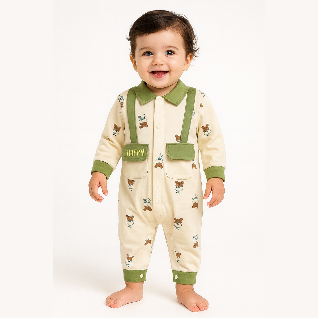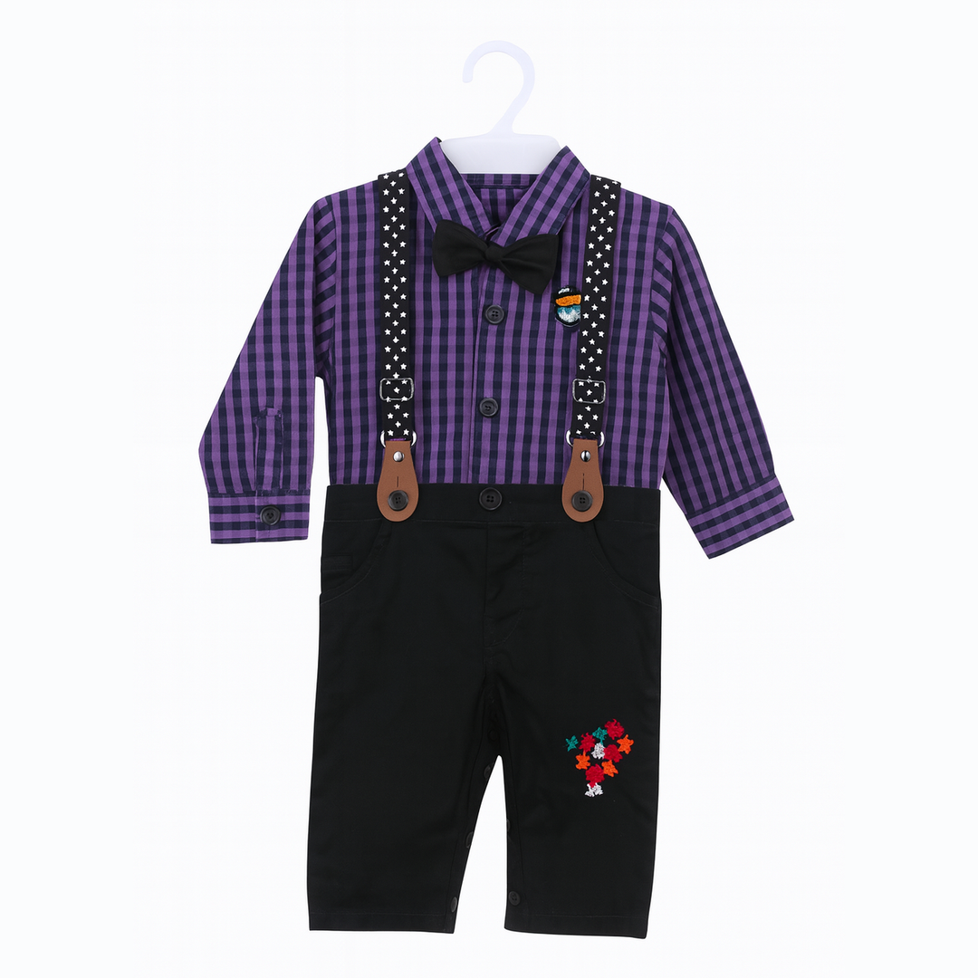 Baby Boy’S Formal Suspender Romper Set Green Checkered Shirt With Bow Tie & Embroidered Overalls