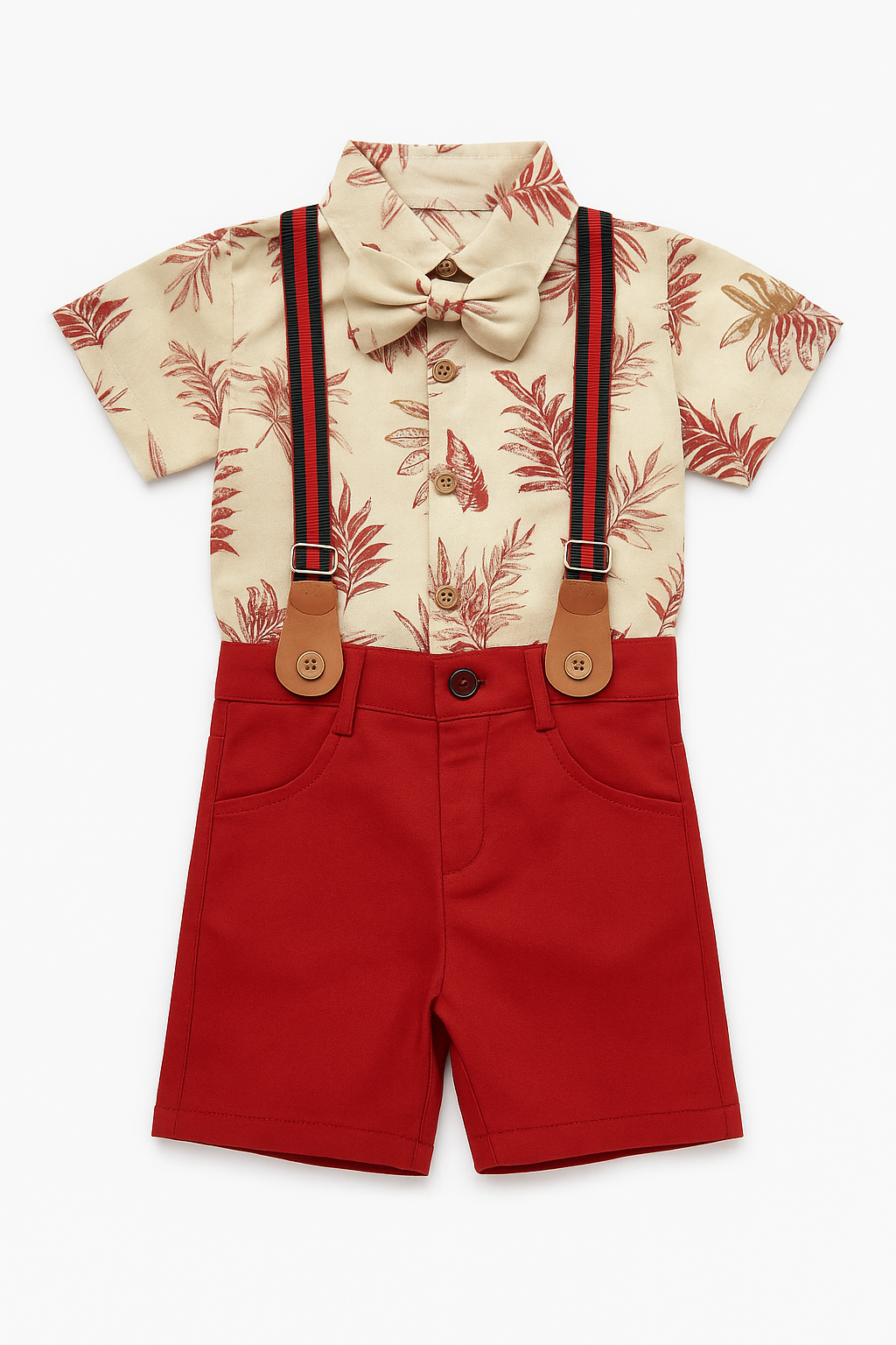 Add a charming vintage flair to your baby boy’s wardrobe with this adorable 3-piece outfit set. Featuring a sage green pinstripe shirt with attached red-and-white suspenders, bright red pants with snap-button closures, a matching bow tie, and a classic beret-style cap, this ensemble blends retro style with modern comfort. Perfect for birthdays, photo shoots, or special events, your little gentleman will be the center of attention.