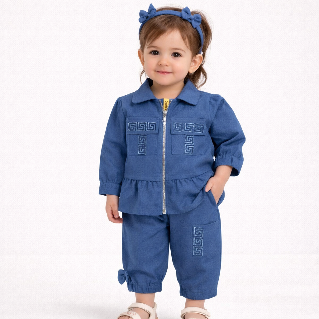 This trendy soft-stretch cotton set features a peplum-style jacket with a classic notched collar and charming shoulder ruffles over a matching floral print base and trousers accented with sweet bow details, offering a chic and playful aesthetic for any outing.
